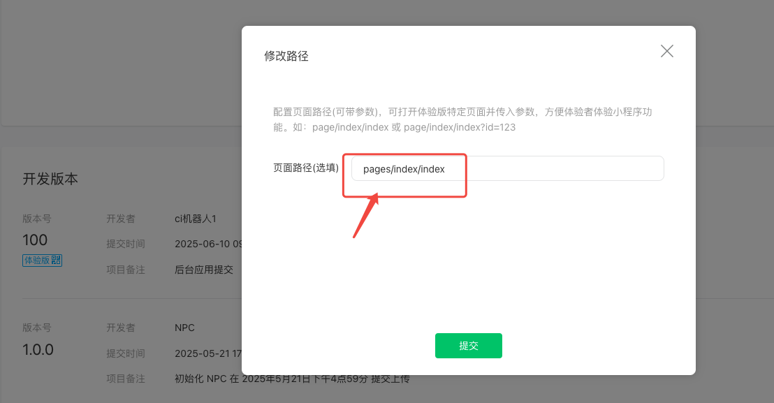 第四步:体验版的生成需要设置正确的路径:pages/index/index